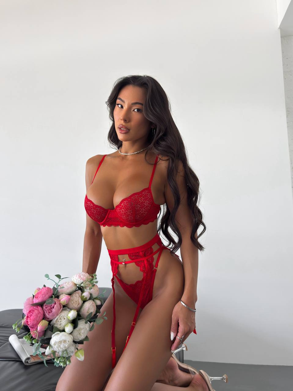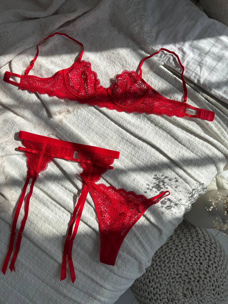 Red Lace Lingerie Set with Chain Detail – Bra, Panties & Garter Belt