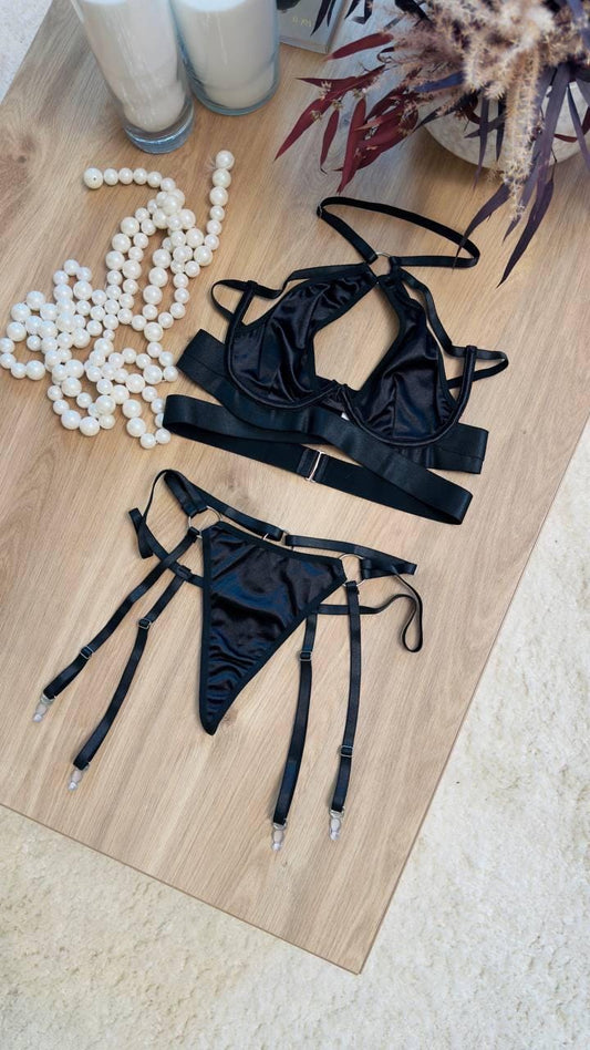 Black Lace Lingerie Set with Chain Detail – Bra, Panties & Garter Belt