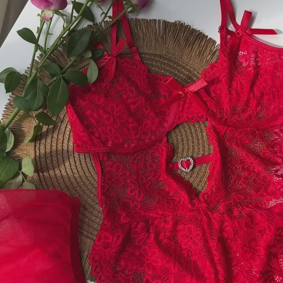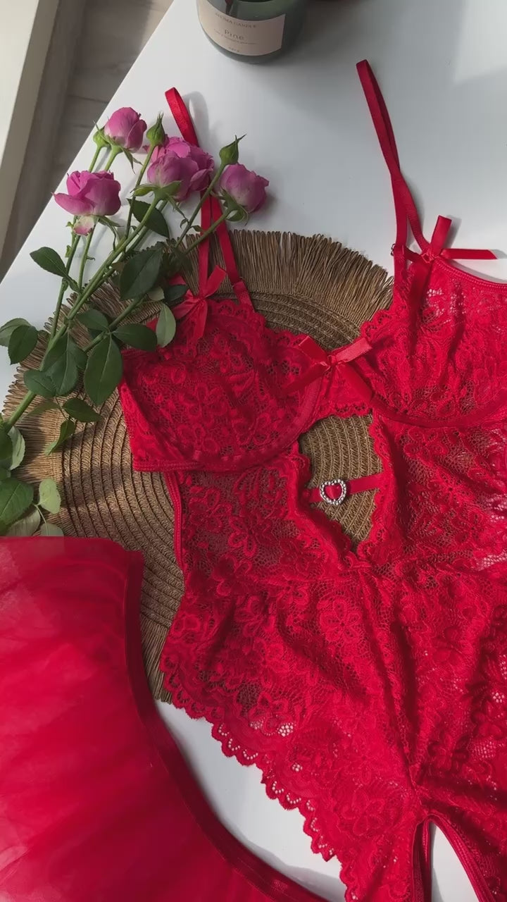 Red Lace Bodysuit Set with Sheer Skirt – Bodysuit & Tulle Overlay