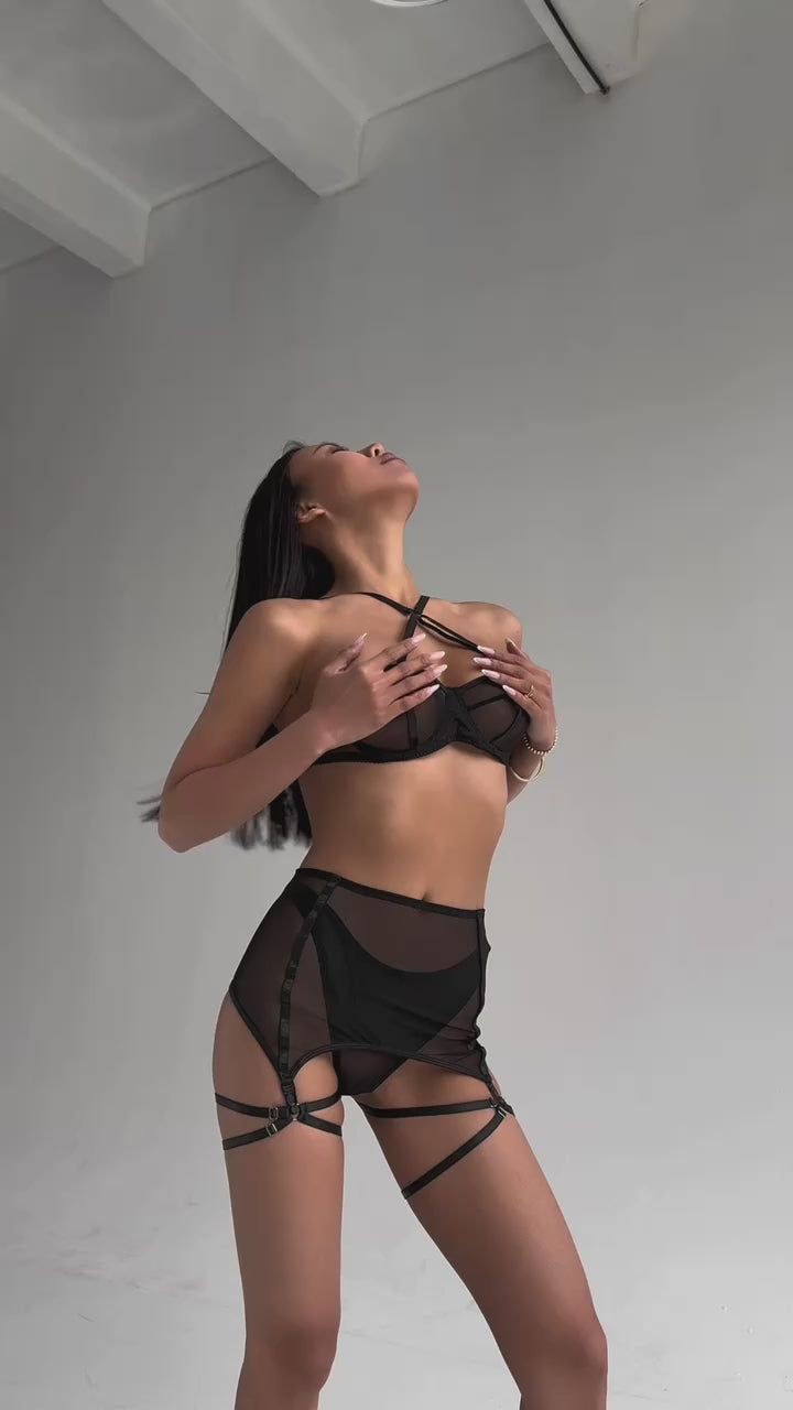 Black Sheer Lingerie Set with Harness Detail – Bra, High-Waist Panties & Garters