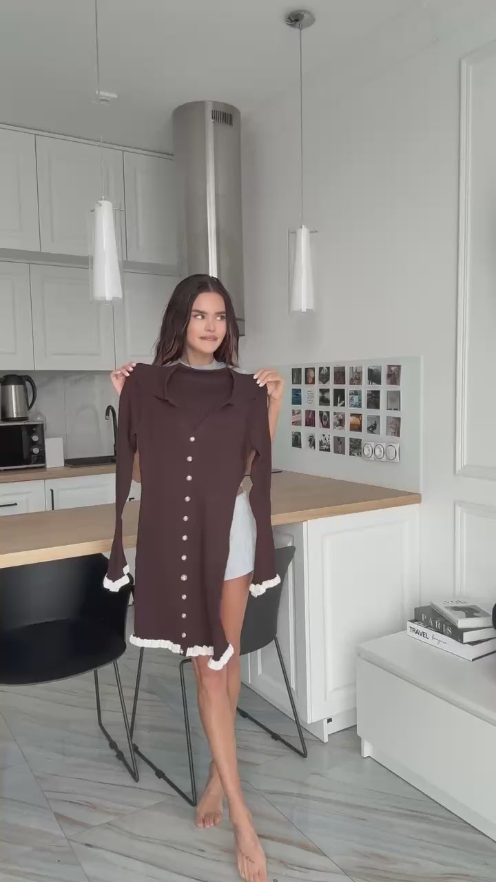 This elegant ribbed knit mini dress is designed to highlight the silhouette while maintaining a refined, feminine aesthetic. Crafted from a soft, stretchy ribbed fabric, it features a flattering V-neckline with a classic collar and decorative gold-tone buttons running down the front.