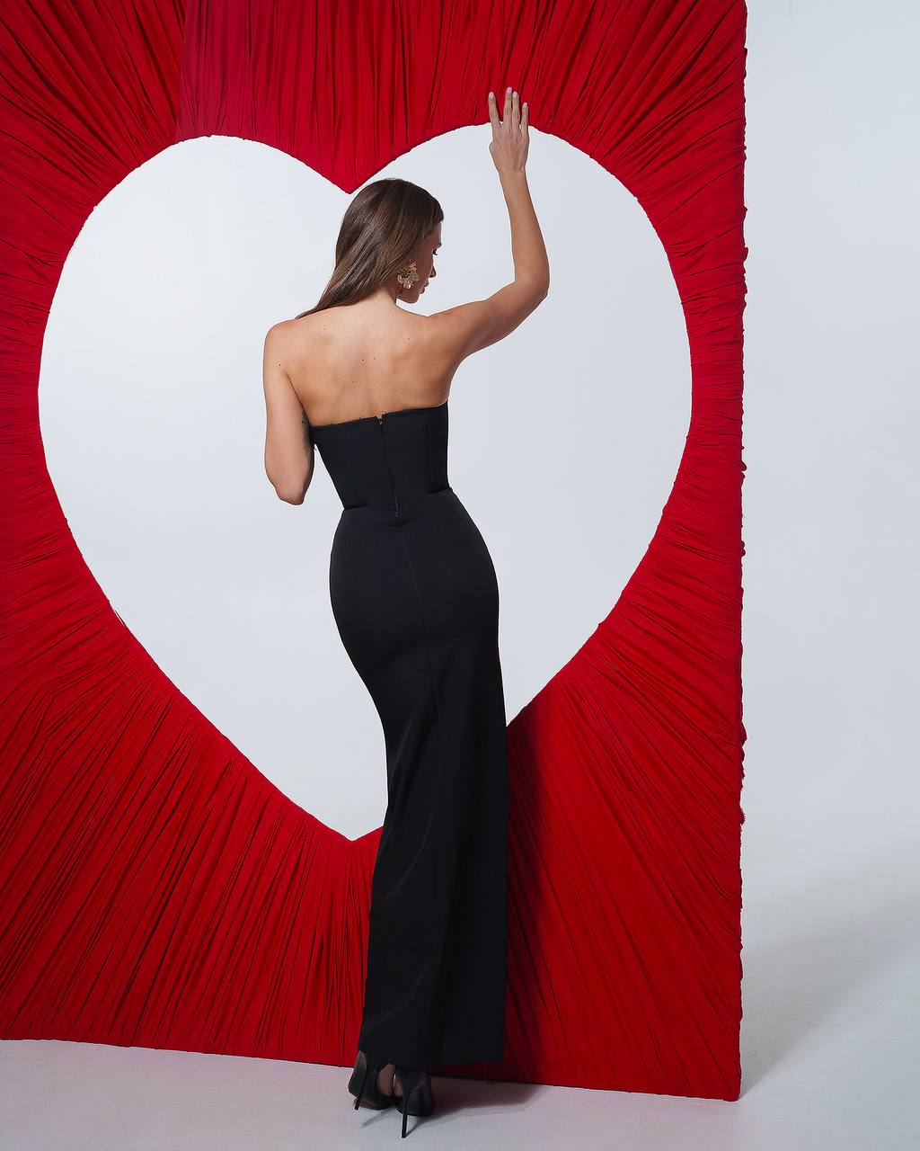 A timeless statement dress designed to accentuate feminine lines with effortless elegance. Crafted in a sleek, structured silhouette, this strapless gown features a refined deep V neckline and a clean, elongated cut that flatters the figure. The minimalist design is elevated by its impeccable tailoring, making it a perfect choice for formal evenings, special occasions, and modern bridal or red-carpet moments.