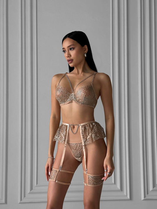 Champagne Lace Lingerie Set with Chain Detail – Bra, Panties & Garter Belt